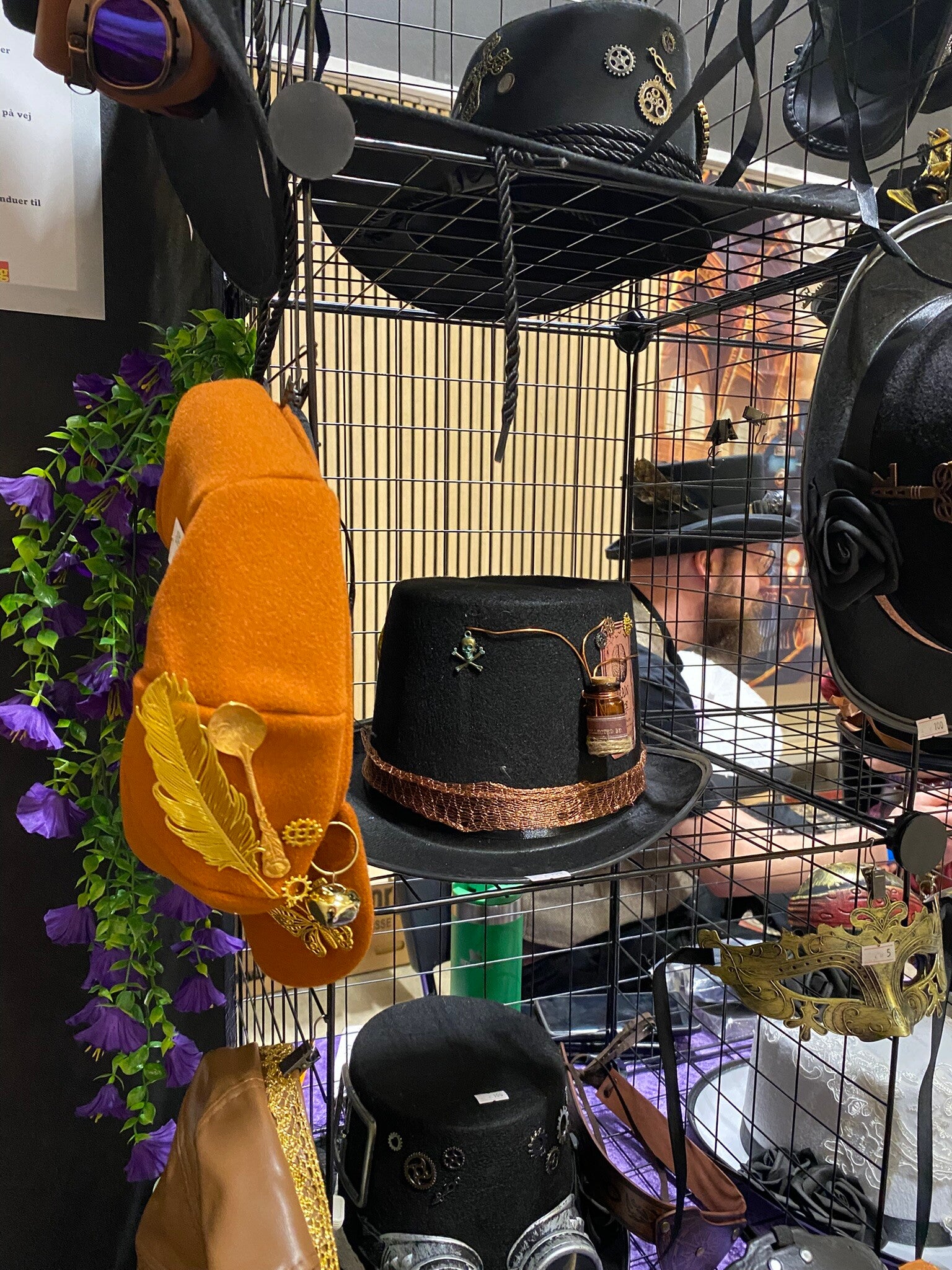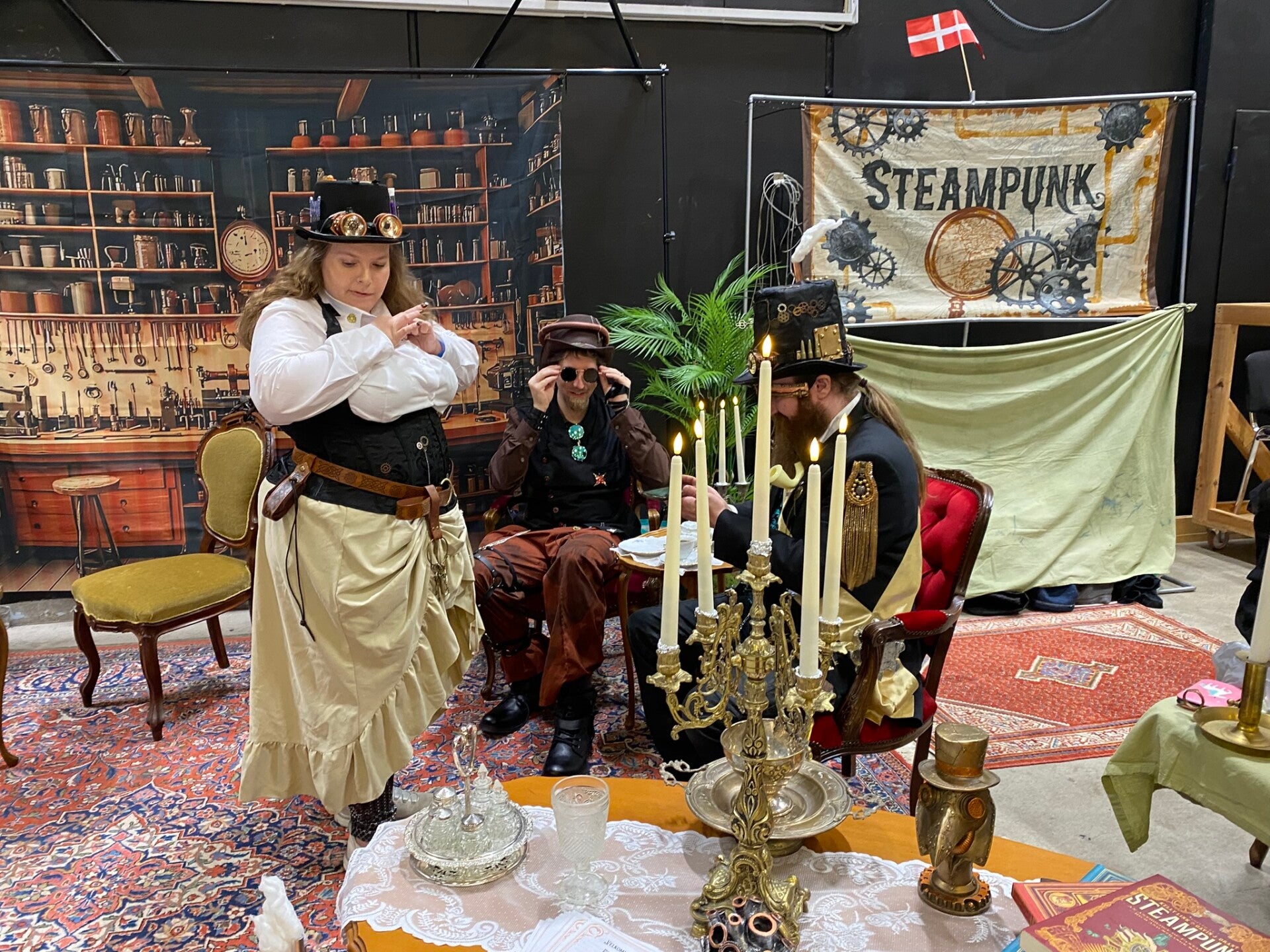 Vores udstilling bestod af en stemningsfuld steampunk-stue, hvor besøgende kunne træde direkte ind i en verden af tandhjul, messing og victoriansk fantasi. Her kunne man gå på opdagelse blandt møbler, dekorative genstande og spændende steampunk-kunst, der tilsammen skabte en helt særlig atmosfære. Midt i stuen kunne de modige – eller nysgerrige – lade sig spå om fremtiden af vores talentfulde spåkone, Gearhilde, som med stor indlevelse og mystik tryllebandt både børn og voksne.